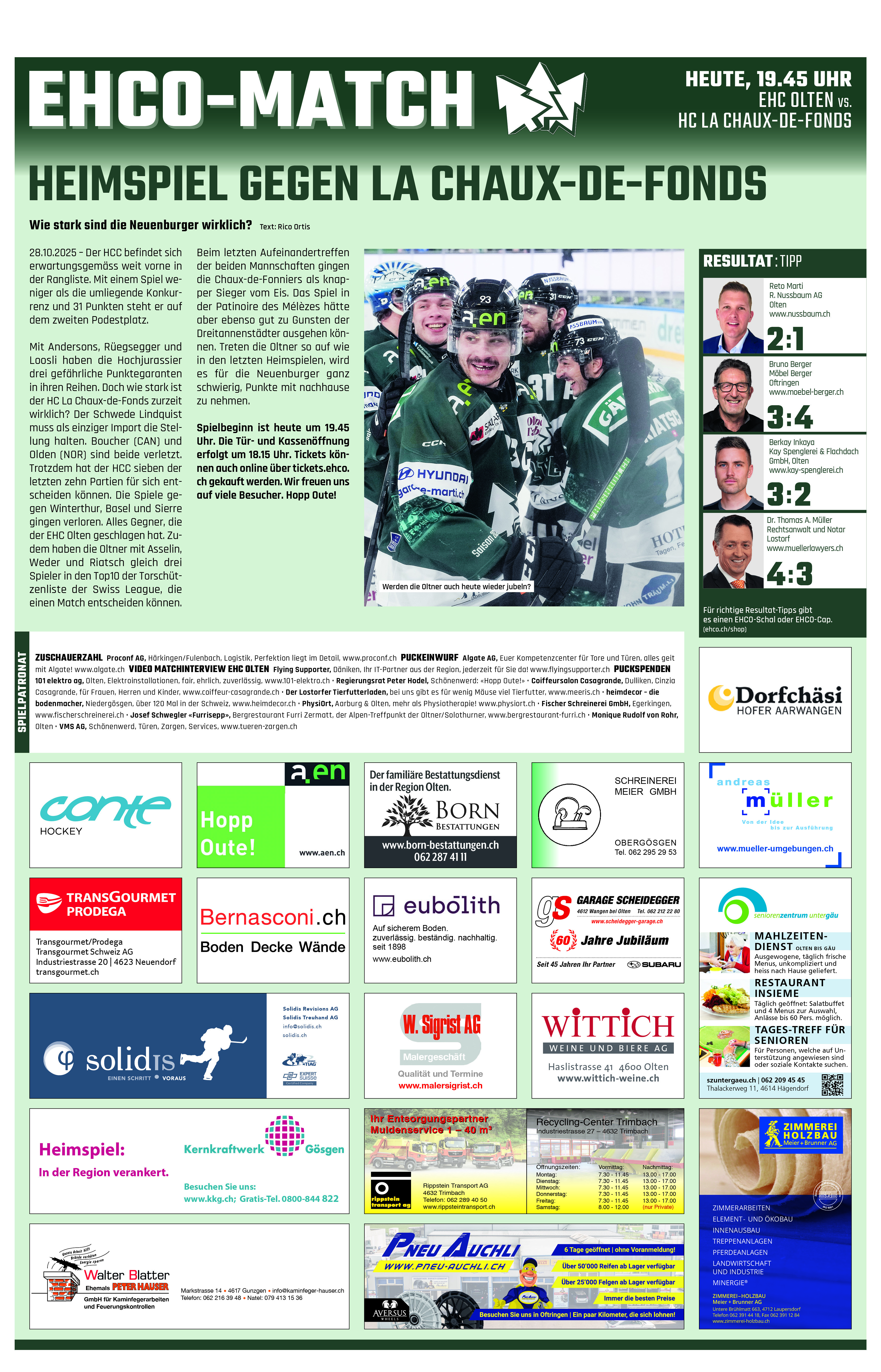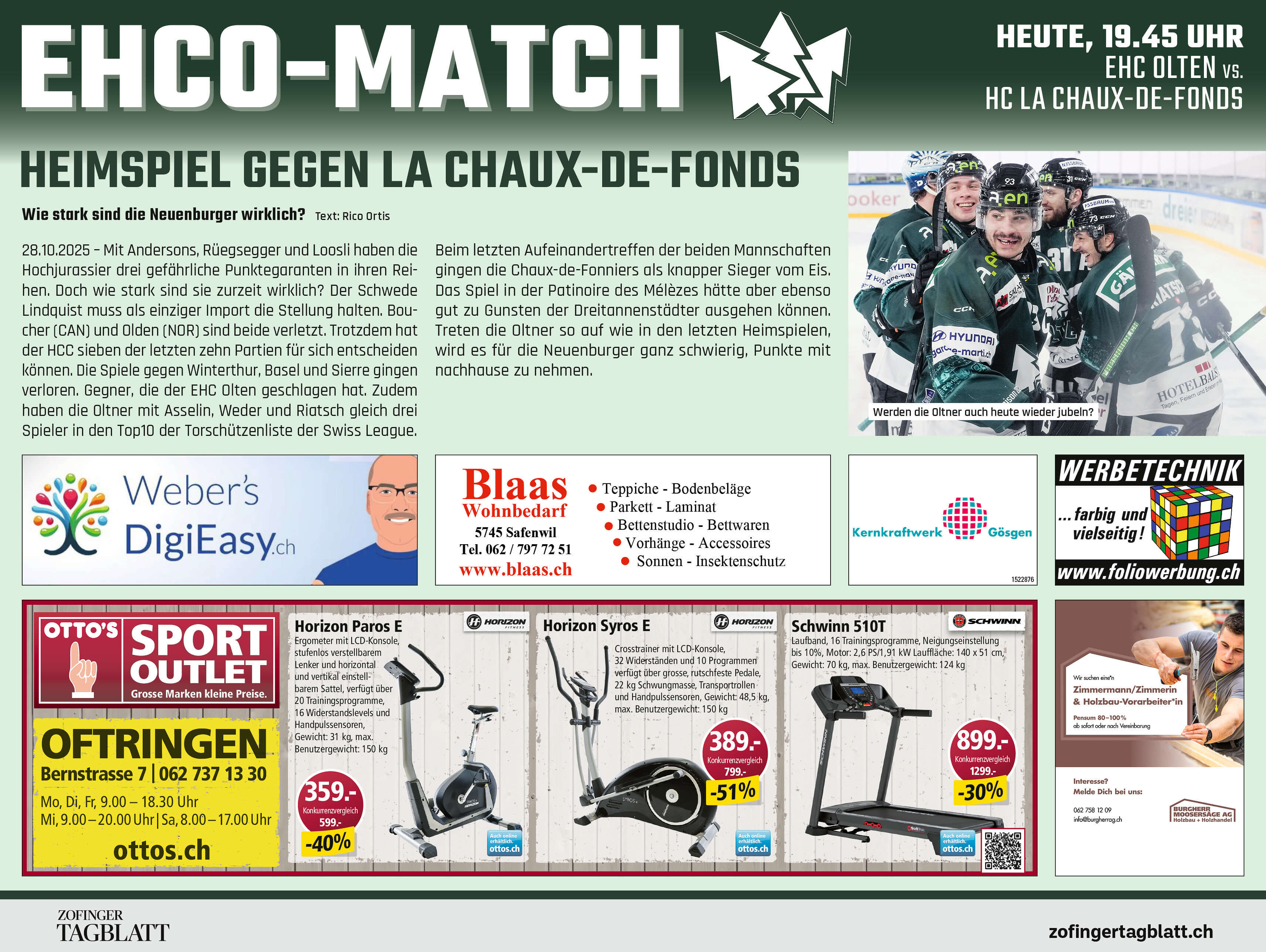 Mit Andersons, Rüegsegger und Loosli haben die Hochjurassier drei gefährliche Punktegaranten in ihren Reihen. Doch wie stark ist der HC La Chaux-de-Fonds zurzeit wirklich? Der Schwede Lindquist muss als einziger Import die Stellung halten. Boucher (CAN) und Olden (NOR) sind beide verletzt. Trotzdem hat der HCC sieben der letzten zehn Partien für sich entscheiden können. Die Spiele gegen Winterthur, Basel und Sierre gingen verloren. Alles Gegner, die der EHC Olten geschlagen hat. Zudem haben die Oltner mit Asselin, Weder und Riatsch gleich drei Spieler in den Top10 der Sky Swiss League Torschützenliste, die einen Match entscheiden können.