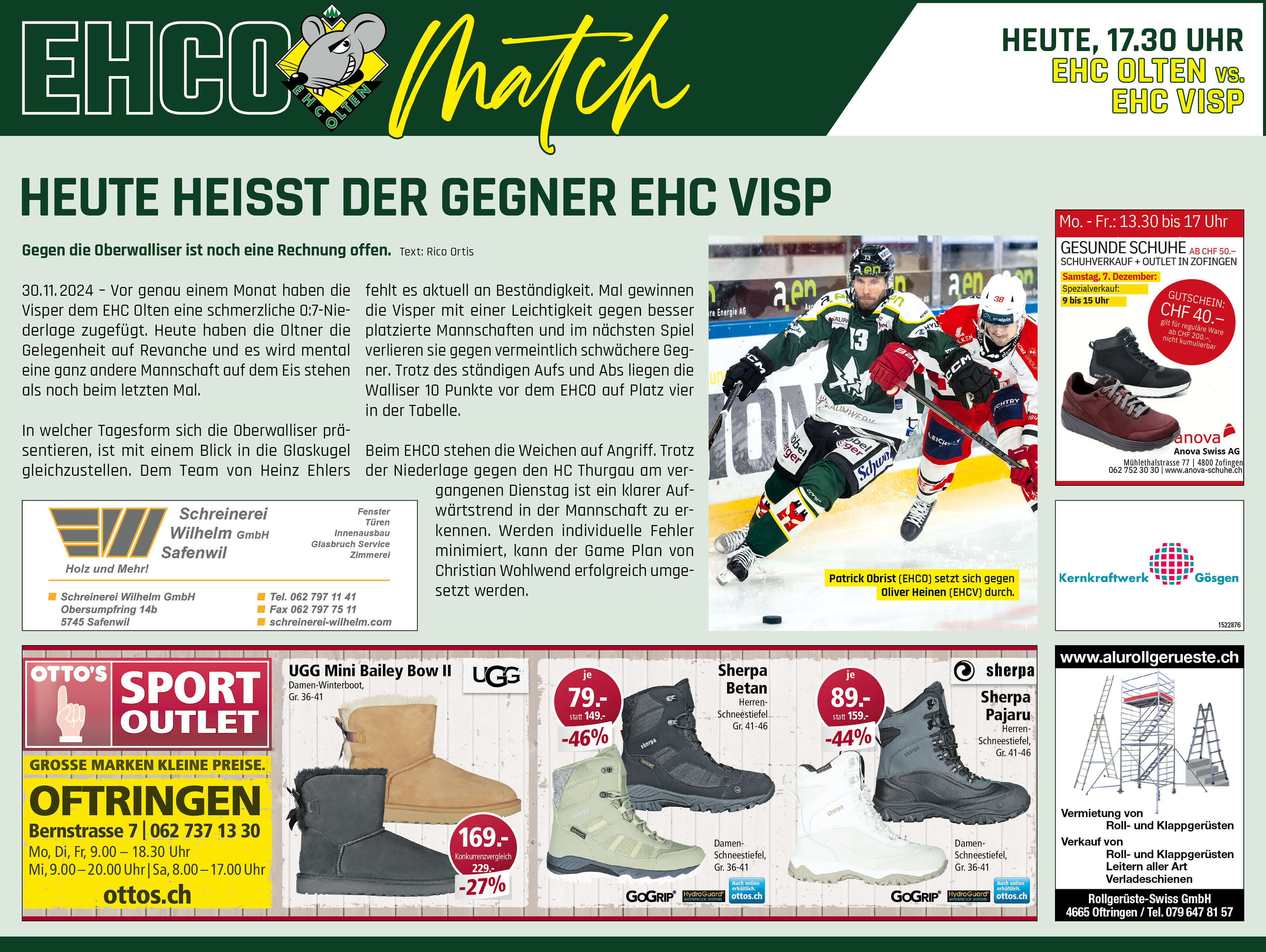 In welcher Tagesform sich die Oberwalliser präsentieren, ist mit einem Blick in die Glaskugel gleichzustellen. Dem Team von Heinz Ehlers fehlt es aktuell an Beständigkeit. Mal gewinnen die Visper mit einer Leichtigkeit gegen besser platzierte Mannschaften und im nächsten Spiel verlieren sie gegen vermeintlich schwächere Gegner. Trotz des ständigen Aufs und Abs liegen die Walliser 10 Punkte vor dem EHCO auf Platz vier in der Tabelle.