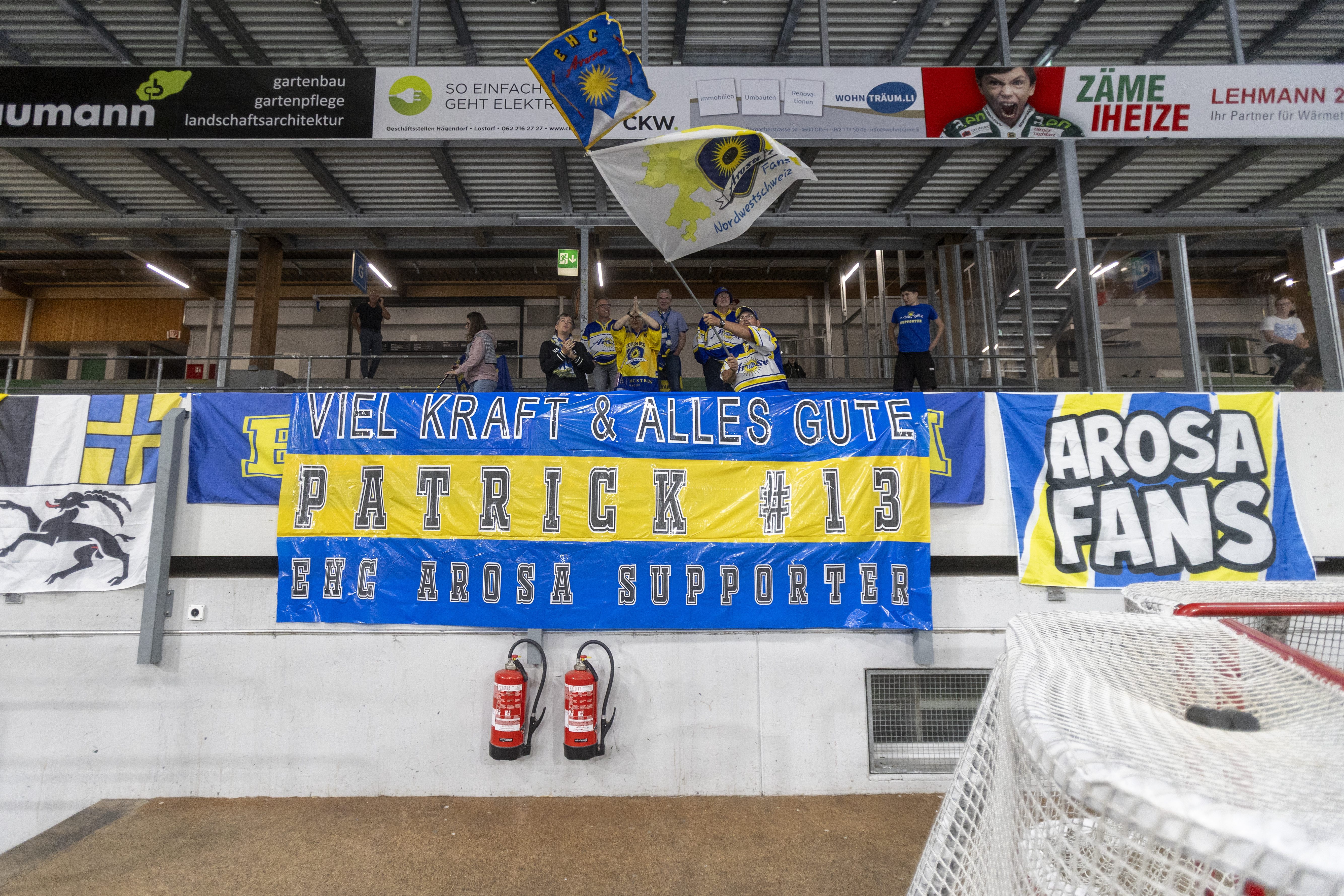 19.08.2025 – Am heutigen Abend begrüsste der EHC Olten den EHC Arosa zum 4. Vorbereitungsspiel. Heute stand zum ersten Mal Guillaume Asselin auf dem Matchblatt. Er wurde nach seiner schweren Verletzung, die er sich in den Playoffs zugezogen hatte, in den ersten Tests geschont. Ebenfalls zurück auf dem Rink war Gianluca Burger. Hank Crone, der gestern zum Team gestossen ist, konnte heute noch nicht mittun. Er erholt sich von einer leichten Fussverletzung. Das Team von Christian Wohlwend konnte heute in den neuen Trikots spielen. Ein gutes Omen. Schönes Detail aus dem Gästesektor: Die Arosa Supporter hissten ein grosses Banner mit aufmunternden Worten für unsere Nummer 13, Patrick Obrist.