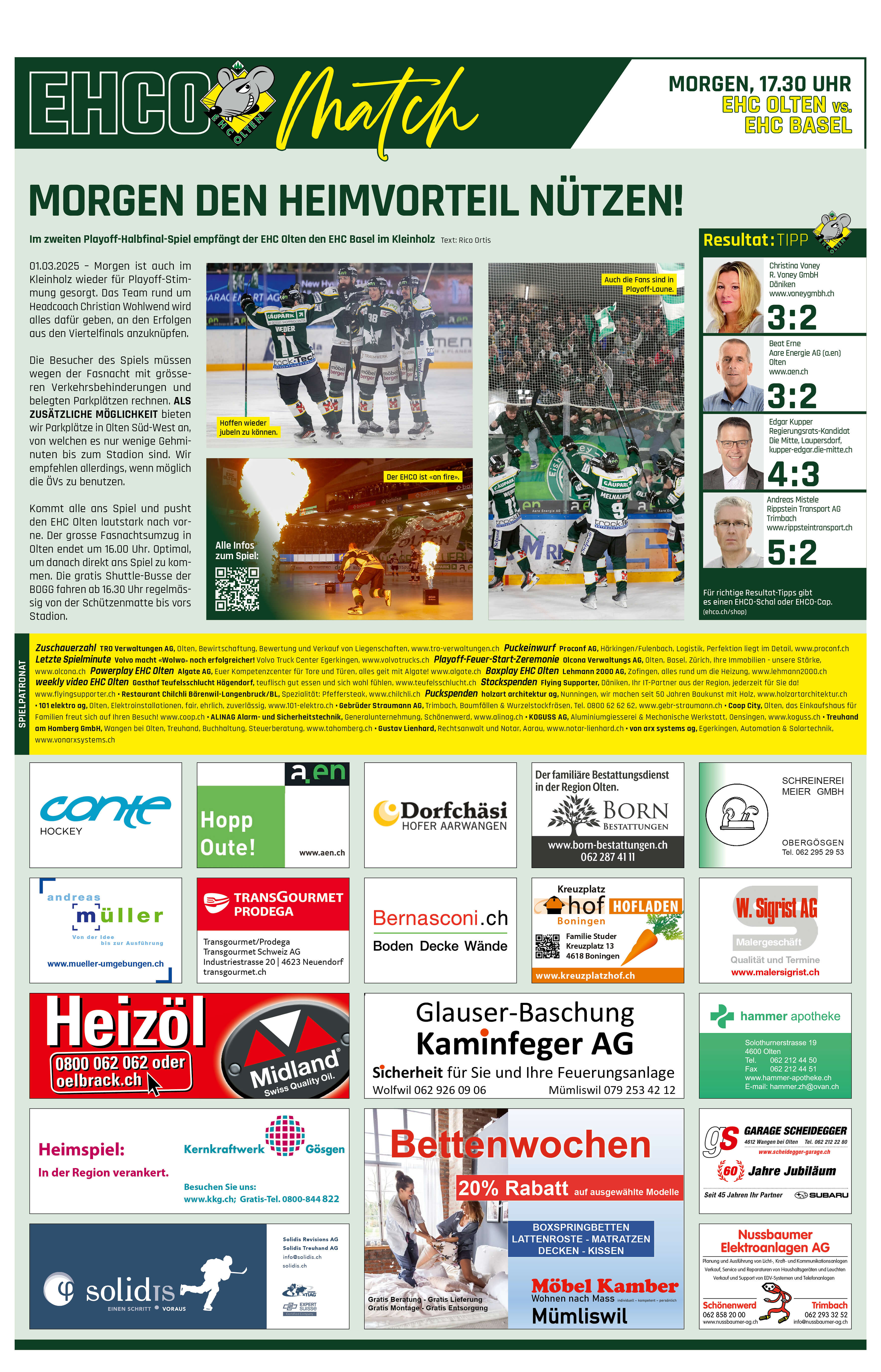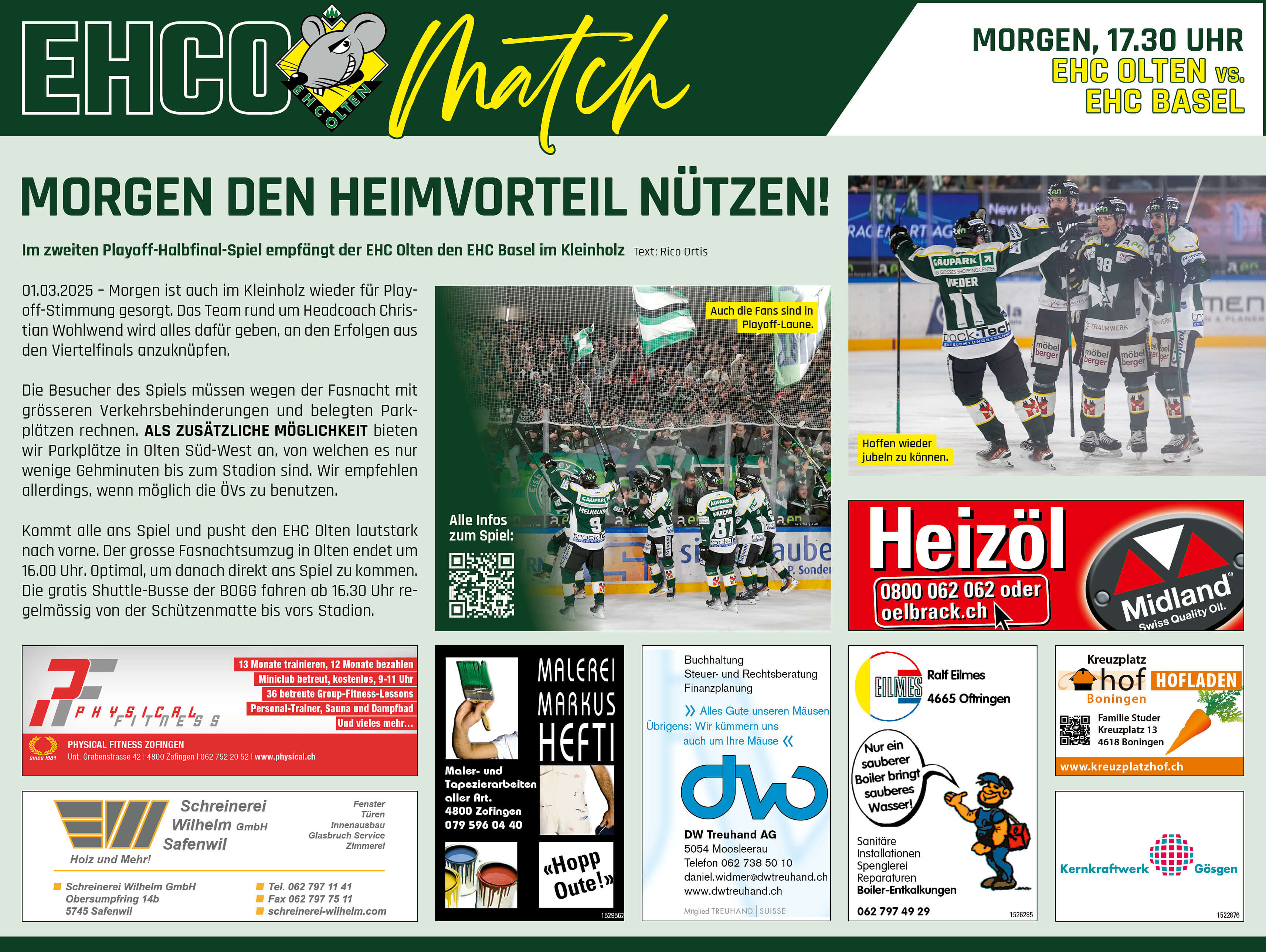 Bitte denkt daran, dass es wegen des Fasnachtsumzugs in Olten zu grossen Verkehrsbehinderungen kommen wird. Wie ihr trotzdem pünktlich und bequem zum Spiel kommt, könnt ihr HIER nachlesen.