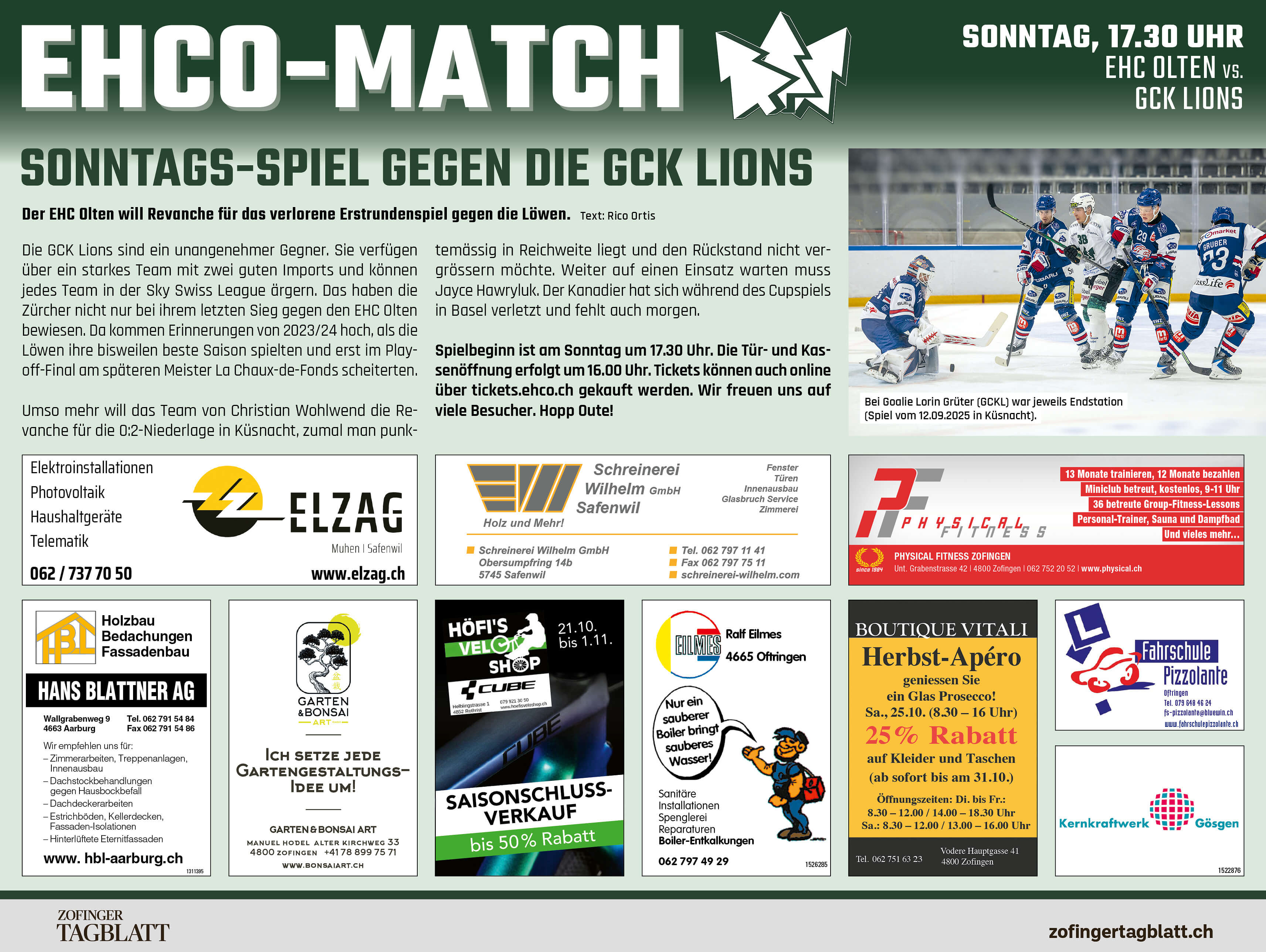 19.10.2025 – Heute findet das erste Heimspiel des EHCO an einem Sonntag statt. Die Anspielzeit, 17:30 Uhr, ist ideal, um den Sonntagnachmittag individuell zu gestalten und das Wochenende mit einem unterhaltsamen Eishockeyabend ausklingen zu lassen.